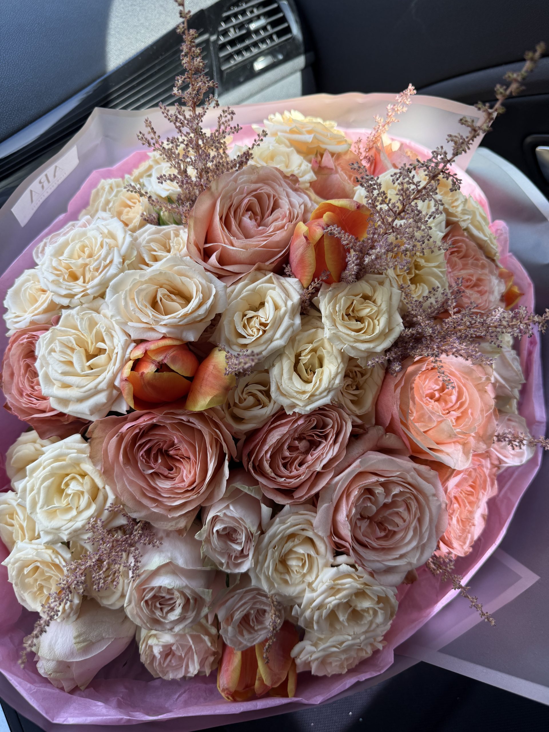 - Standard: 7 TRANDAFIRI PORTOCALII, 7 ROZ, 9 MINI ROSES IVOIRE , 10 LALELE – Panglică – Felicitare Cadou